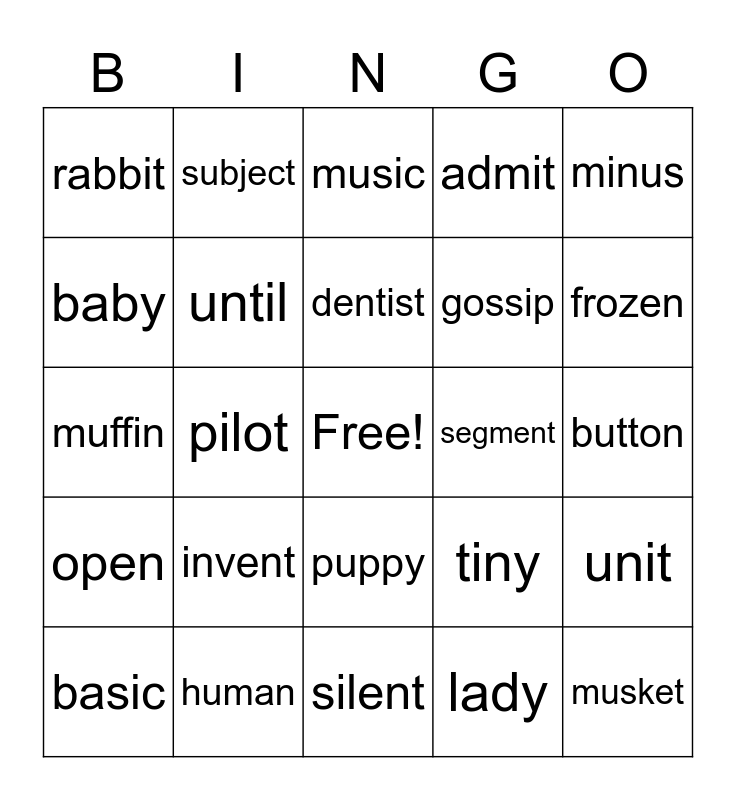 This bingo card has a free space and 24 words: invent, human, dentist, basic, minus, rabbit, baby, subject, segment, puppy, gossip, muffin, tiny, unit, until, lady, button, music, frozen, pilot, musket, open, admit and silent.