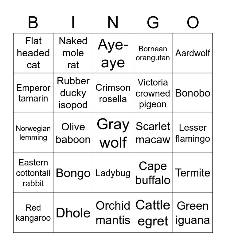 This bingo card has 104 words: Free!, Aardvark, Aardwolf, Adelie penguin, Aedes mosquito, African land snail, African leopard, African spurred tortoise, African wild dog, American alligator, American bison, Arctic tern, Asian carp, Asian elephant, Atlantic puffin, Aurochs, Aye-aye, Bactrian camel, Bald eagle, Barreleye, Bengal tiger, Bighorn sheep, Black and white ruffed lemur, Black rhino, Blue wildebeest, Bongo, Bonobo, Bornean orangutan, Bottlenose dolphin, Brazilian tapir, Cape buffalo, Cattle egret, Cheetah, Chinchilla, Common chimpanzee, Common hippopotamus, Common hippopotamus, Common ostrich, Crimson rosella, Dhole, Drill, Eastern cottontail rabbit, Emperor penguin, Emperor tamarin, Eurasian boar, Flat headed cat, Golden scarab beetle, Gray wolf, Great white shark, Green iguana, Green racquet-tailed parakeet, Green sea turtle, Grevy's zebra, Guanaco, Honeypot ant, Impala, Indian gharial, Koala, Kuhli loach, Ladybug, Lesser flamingo, Llama, Malayan tapir, Masai giraffe, Mata mata turtle, Monarch butterfly, Moose, Naked mole rat, Norwegian lemming, Olive baboon, Orchid mantis, Osprey, Pacific parrotlet, Pere David's deer, Pronghorn, Pyrenian ibex, Red fox, Red kangaroo, Red-tailed cockatoo, Reticulated giraffe, Ring-tailed lemur, Rock dove, Rubber ducky isopod, Sable, Scarlet macaw, Serow, Spotted hyena, Springhare, Squirrel monkey, Sumatran rhino, Sun conure, Swordfish, Tasmanian devil, Termite, Tibetan sand fox, Tiger quoll, Tiger shark, Victoria crowned pigeon, Vicuna, Viscacha, Western lowland gorilla, White rhino, Wooly spider monkey and Yak.