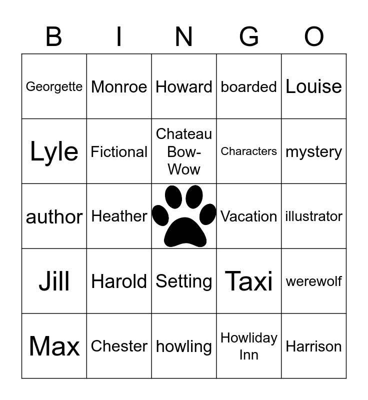 This bingo card has a free space and 24 words: Harold, Chester, Chateau Bow-Wow, Max, Louise, Georgette, Lyle, Monroe, Vacation, Setting, Characters, author, Taxi, werewolf, Fictional, Howliday Inn, illustrator, Howard, mystery, Heather, Harrison, Jill, boarded and howling.