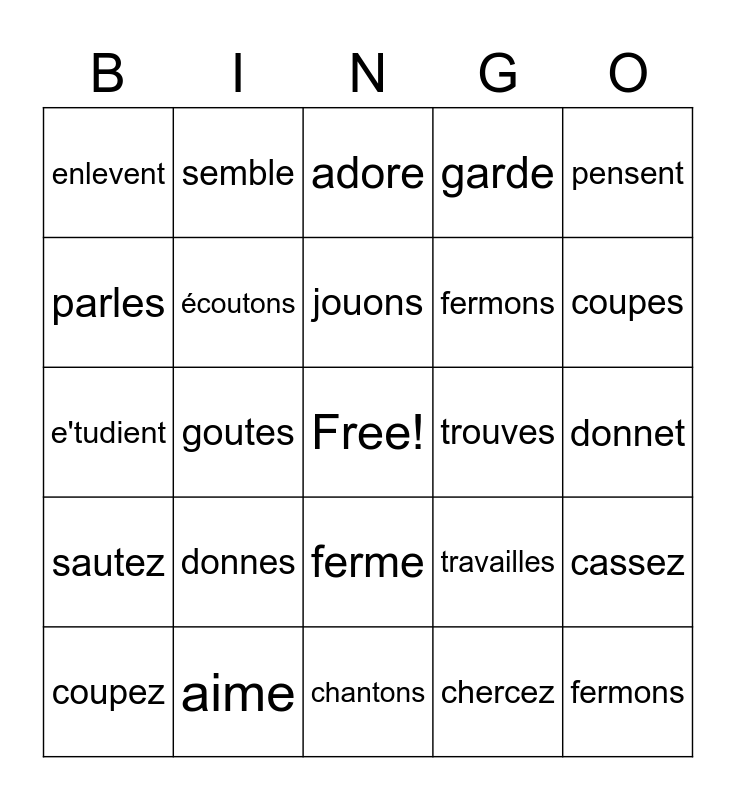 This bingo card has a free space and 24 words: donnes, aime, jouons, coupez, pensent, enlevent, parles, semble, trouves, ferme, fermons, e'tudient, travailles, cassez, écoutons, chercez, donnet, adore, coupes, goutes, fermons, sautez, garde and chantons.