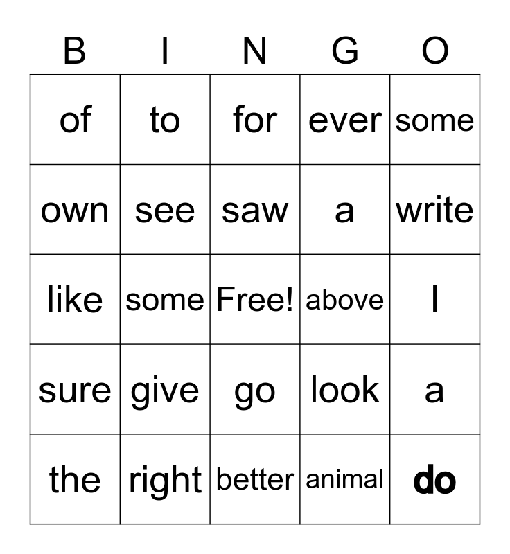 This bingo card has a free space and 24 words: the, give, saw, animal, some, of, to, for, above, I, like, see, look, a, own, right, better, ever, write, sure, some, go, a and do.