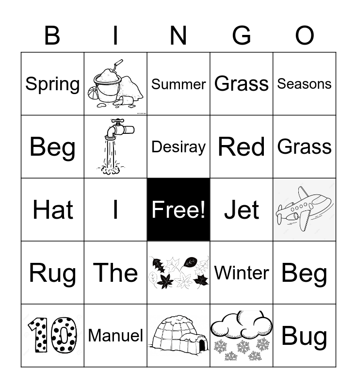 This bingo card has 10 images, a free space and 21 words: Like, I, Spring, Summer, Winter, Jet, Bug, Beg, Grass, Beg, The, Rug, Seasons, Fall, Red, Beg, Grass, Hat, Manuel, Desiray and Leonardo.