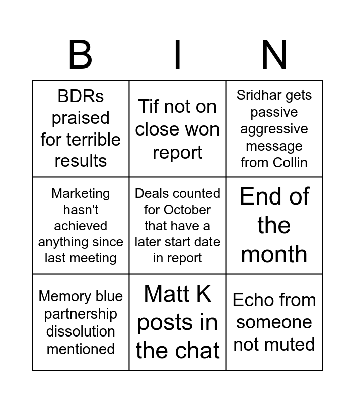 This bingo card has 9 words: Memory blue partnership dissolution mentioned, Deals counted for October that have a later start date in report, Sridhar gets passive aggressive message from Collin, BDRs praised for terrible results, Tif not on close won report, End of the month, Marketing hasn't achieved anything since last meeting, Matt K posts in the chat and Echo from someone not muted.