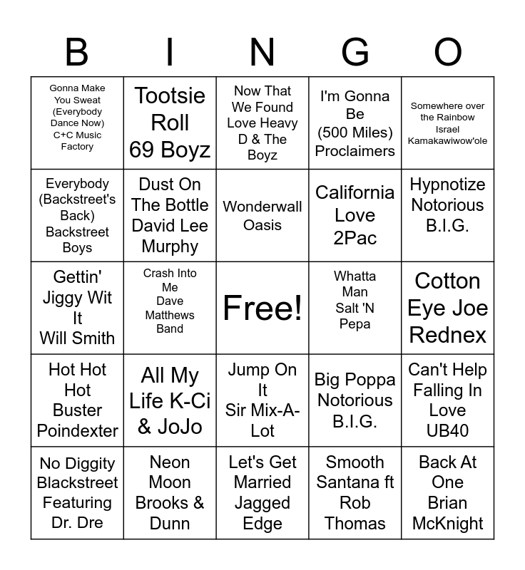 This bingo card has a free space and 98 words: Electric Slide Marcia Griffiths, Baby Got Back Sir Mix-A-Lot, Friends In Low Places Garth Brooks, Cotton Eye Joe Rednex, Macarena Los Del Rio, Ice Ice Baby Vanilla Ice, I Don't Want To Miss A Thing Aerosmith, Amazed Lonestar, Jump Around House Of Pain, It's Your Love Tim McGraw with Faith Hill, My Best Friend Tim McGraw, Boot Scootin' Boogie Brooks & Dunn, This Is How We Do It Montell Jordan, All My Life K-Ci & JoJo, When You Say Nothing At All Alison Krauss, Tootsie Roll 69 Boyz, Gettin' Jiggy Wit It Will Smith, I Cross My Heart George Strait, U Can't Touch This M.C. Hammer, Everything I Do) I Do It For You Bryan Adams, Mambo No. 5 (A Little Bit Of...) Lou Bega, Wannabe Spice Girls, Grease Megamix John Travolta & Olivia Newton-John, Can You Feel The Love Tonight Elton John, From This Moment On Shania Twain, Gonna Make You Sweat (Everybody Dance Now) C+C Music Factory, Let's Get Married Jagged Edge, The Humpty Dance Digital Underground, Let Me Clear My Throat DJ Kool, Poison Bell Biv DeVoe, No Diggity Blackstreet Featuring Dr. Dre, Everybody (Backstreet's Back) Backstreet Boys, I'll Be Edwin McCain, The Dance Garth Brooks, Hypnotize Notorious B.I.G., Have I Told You Lately Rod Stewart, I'm Gonna Be (500 Miles) Proclaimers, Truly Madly Deeply Savage Garden, Crash Into Me Dave Matthews Band, C'mon 'N Ride It (The Train) Quad City DJ's, Because You Loved Me Celine Dion, Wonderwall Oasis, California Love 2Pac, Good Vibrations Marky Mark & The Funky Bunch, Butterfly Kisses Bob Carlisle, Jump On It Sir Mix-A-Lot, What Is Love Haddaway, She Thinks My Tractor's Sexy Kenny Chesney, Apache Sugarhill Gang, I Want It That Way Backstreet Boys, Shoop Salt-N-Pepa, I Will Always Love You Whitney Houston, I Like it, I Love it Tim McGraw, Iris Goo Goo Dolls, Thunderstruck AC/DC, You're Still The One Shania Twain, Hot Hot Hot Buster Poindexter, Mo Money Mo Problems Notorious B.I.G., I'm Too Sexy Right Said Fred, Ain't Going Down (Til The Sun Comes Up) Garth Brooks, Only Wanna Be With You Hootie & The Blowfish, Me And You Kenny Chesney, Groove Is In The Heart Deee-Lite, What I Got Sublime, Time Of Your Life (Good Riddance) Green Day, Achy Breaky Heart Billy Ray Cyrus, Whoomp! (There It Is) Tag Team, To Make You Feel My Love Garth Brooks, I Swear All-4-One, Back That Thang Up Juvenile, Now That We Found Love Heavy D & The Boyz, Man! I Feel Like A Woman! Shania Twain, Smooth Santana ft Rob Thomas, Hold On Wilson Phillips, Motownphilly Boyz II Men, Jump Kris Kross, I Swear John Michael Montgomery, Livin' La Vida Loca Ricky Martin, Watermelon Crawl Tracy Byrd, Back At One Brian McKnight, Check Yes Or No George Strait, Dust On The Bottle David Lee Murphy, Neon Moon Brooks & Dunn, You Had Me From Hello Kenny Chesney, Vogue Madonna, Santeria Sublime, Gin And Juice Snoop Doggy Dogg, Any Man Of Mine Shania Twain, Can't Help Falling In Love UB40, Strawberry Wine Deana Carter, Jump Jive An' Wail Brian Setzer Orchestra, Big Poppa Notorious B.I.G., I Could Not Ask For More Edwin McCain, Barbie Girl Aqua, Whatta Man Salt 'N Pepa, I Like It I Love It Tim McGraw, Somewhere over the Rainbow Israel Kamakawiwow'ole and Regulate Warren G. & Nate Dogg.