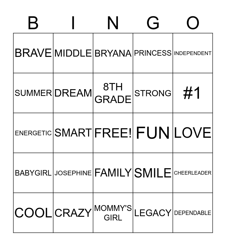 This bingo card has a free space and 24 words: JOSEPHINE, CRAZY, 8TH GRADE, COOL, INDEPENDENT, BRAVE, SUMMER, MIDDLE, FUN, FAMILY, STRONG, ENERGETIC, SMILE, CHEERLEADER, DREAM, LEGACY, LOVE, BRYANA, #1, SMART, DEPENDABLE, BABYGIRL, PRINCESS and MOMMY'S GIRL.