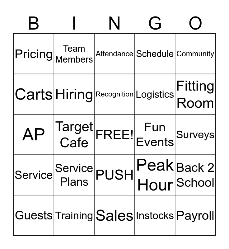 This bingo card has a free space and 34 words: Redcards, Instocks, Zone, Vibe, Service, Hiring, Community, Guests, Team Members, 5 %, Recognition, Attendance, Punch Correction, Meals, Fun Events, Fitting Room, Training, AP, Service Plans, Peak Hour, PUSH, CAFS, Pricing, Surveys, Sales, Payroll, Schedule, Pharmacy, Logistics, Carts, Starbucks, Target Cafe, Back 2 School and Safety.