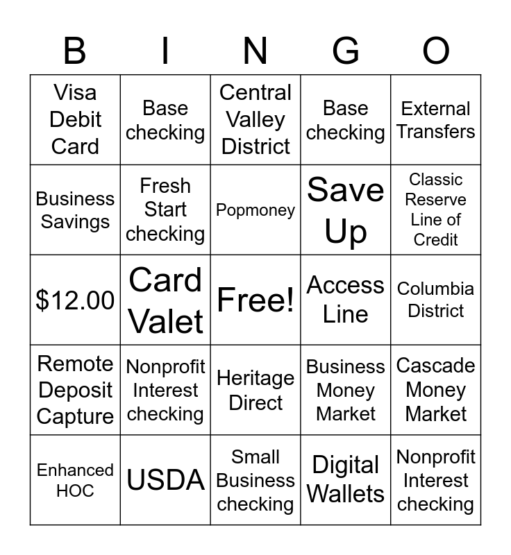This bingo card has a free space and 46 words: Small Business checking, Nonprofit Interest checking, Ascent, Small Business checking, Nonprofit Interest checking, Ascent checking, Base checking, Business Interest checking, Business Savings, Summit checking, Fresh Start checking, Base checking, Cascade Money Market, Business Money Market, Premier checking, Alpine savings, Popmoney, Access Line, Bill Pay, External Transfers, Card Valet, Digital Wallets, Visa Debit Card, Save Up, Mobile Remote Deposit, Classic Reserve Line of Credit, Enhanced HOC, Heritage Overdraft Coverage, Heritage Direct, Remote Deposit Capture, Merchant Services, Lockbox Service, Health Savings Account, Construction Loans, Manufactured Homes, USDA, Columbia District, Capital District, South Sound District, North Sound District, Central Sound District, Central Valley District, $12.00, $4.00, $5.00 and $3.00.