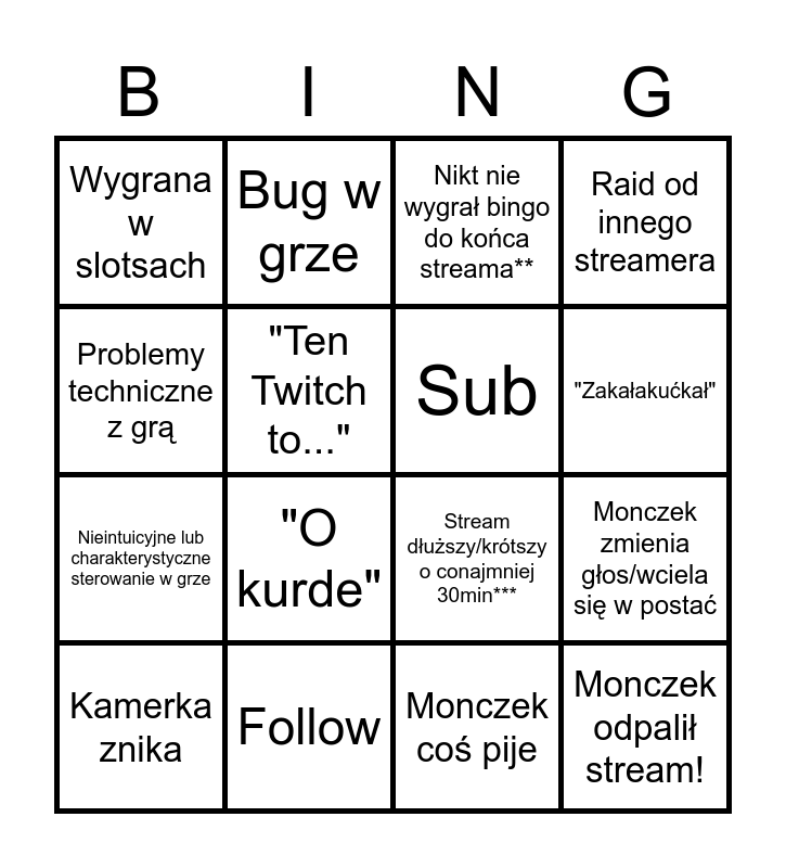 This bingo card has 23 words: Monczek odpalił stream!, Przegląd memów/wiadomości, "Zakałakućkał", Monczek umiera/przegrywa w grze, Problemy techniczne z grą, Wygrana w slotsach, "Ten Twitch to...", Bug w grze, Kamerka znika, Ktoś wykupuje coś za punkty, "O kurde", Nieintuicyjne lub charakterystyczne sterowanie w grze, Dygresja na streamie, Kącik polityczny, Follow, Monczek robi faila i zdaje sobie z tego sprawę w grze, Nikt nie wygrał bingo do końca streama**, Stream dłuższy/krótszy o conajmniej 30min***, Sub, Monczek zmienia głos/wciela się w postać, Raid od innego streamera, Monczek coś pije and (S)Ktoś inny wygrywa bingo*.
