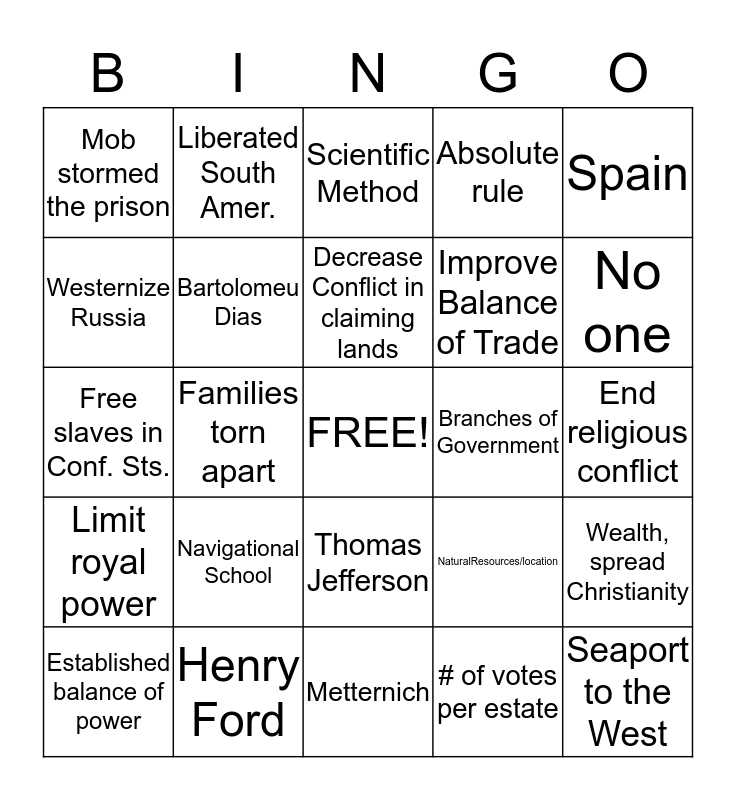 This bingo card has a free space and 37 words: Art and Learning, Painter, Sculpter, Inventor, Catholic and Protestant, Bartolomeu Dias, Wealth, spread Christianity, Navigational School, Decrease Conflict in claiming lands, Hernando Cortes, Spain, Sell more than it buys, Families torn apart, Absolute rule, Seaport to the West, End religious conflict, Westernize Russia, Limit royal power, Nicolaus Copernicus, Scientific Method, Thomas Jefferson, Branches of Government, Mob stormed the prison, No one, Established balance of power, Metternich, Security and stability, # of votes per estate, Liberated South Amer., England 18thCent Machines, No gov. interference, Unions, Pop growth faster/housing, Henry Ford, Free slaves in Conf. Sts., Election of A. Lincoln, NaturalResources/location, Improve Balance of Trade and Discourage Colonz. in LA.