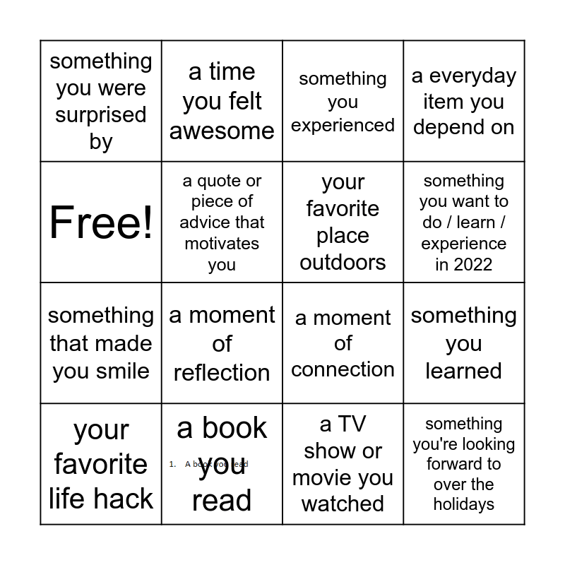 This bingo card has 1 images and 16 words: a book you read, something you learned, something you experienced, something you were surprised by, something that made you smile, a time you felt awesome, a moment of connection, a TV show or movie you watched, Free!, a quote or piece of advice that motivates you, your favorite life hack, a everyday item you depend on, a moment of reflection, something you want to do / learn / experience in 2022, your favorite place outdoors and something you're looking forward to over the holidays.