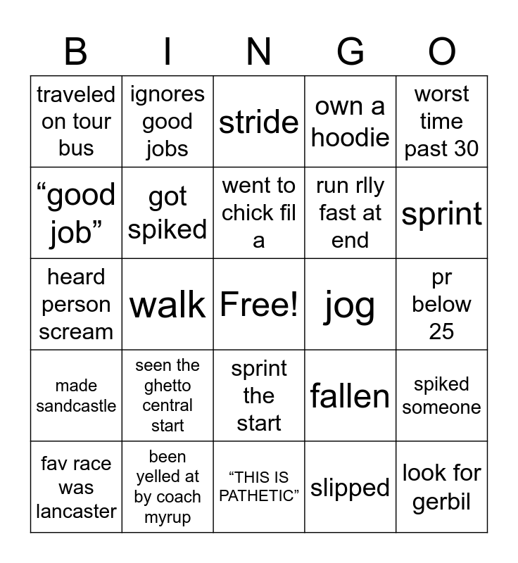 This bingo card has a free space and 24 words: seen the ghetto central start, been yelled at by coach myrup, went to chick fil a, fav race was lancaster, worst time past 30, traveled on tour bus, “good job”, ignores good jobs, jog, sprint the start, run rlly fast at end, heard person scream, fallen, spiked someone, got spiked, slipped, pr below 25, stride, sprint, walk, look for gerbil, made sandcastle, own a hoodie and “THIS IS PATHETIC”.