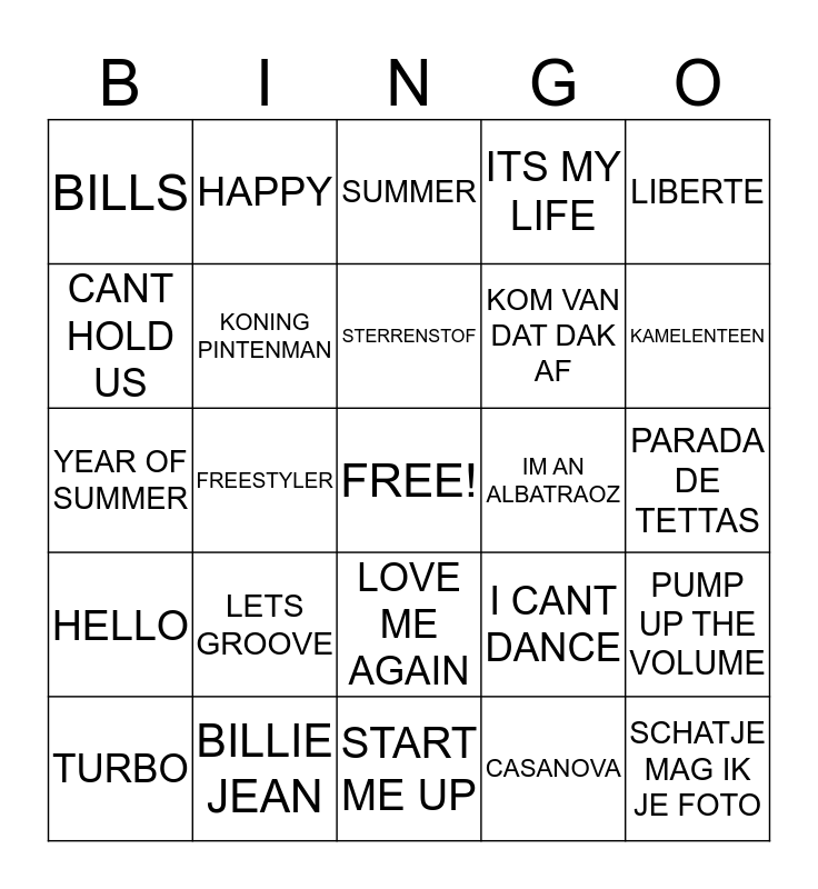 This bingo card has a free space and 24 words: LETS GROOVE, BILLIE JEAN, STERRENSTOF, TURBO, LIBERTE, BILLS, CANT HOLD US, HAPPY, IM AN ALBATRAOZ, LOVE ME AGAIN, KOM VAN DAT DAK AF, YEAR OF SUMMER, I CANT DANCE, PUMP UP THE VOLUME, KONING PINTENMAN, CASANOVA, PARADA DE TETTAS, SUMMER, KAMELENTEEN, FREESTYLER, SCHATJE MAG IK JE FOTO, HELLO, ITS MY LIFE and START ME UP.
