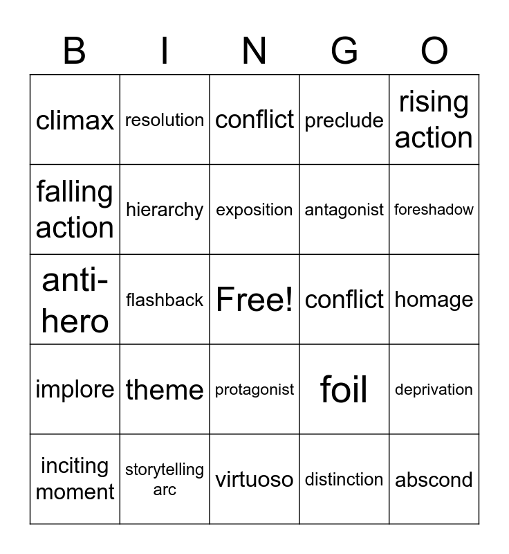 This bingo card has a free space and 24 words: theme, storytelling arc, exposition, inciting moment, rising action, climax, falling action, resolution, conflict, protagonist, antagonist, anti-hero, foil, deprivation, hierarchy, distinction, homage, conflict, foreshadow, flashback, abscond, implore, preclude and virtuoso.