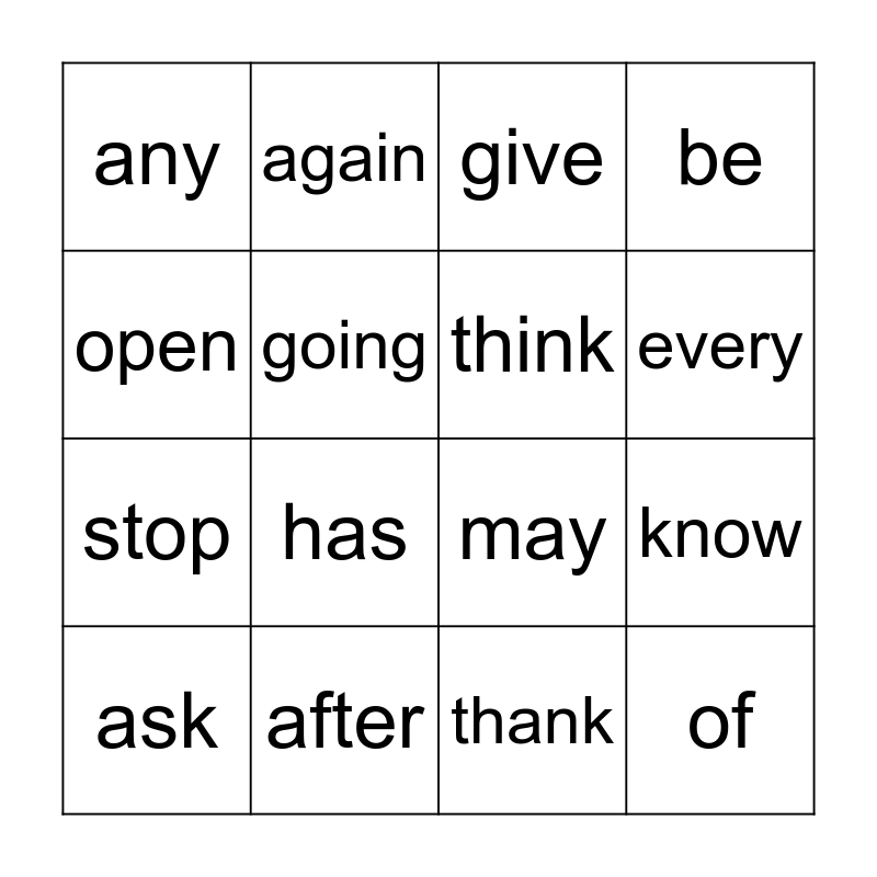 This bingo card has 16 words: after, know, give, any, stop, again, may, thank, open, going, ask, be, has, every, think and of.