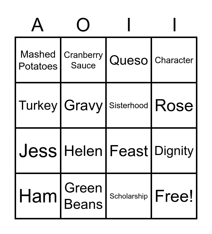 This bingo card has 23 words: Free!, Panda, Rose, Ruby, Turkey, Mashed Potatoes, Gravy, Cranberry Sauce, Ham, Stella, Helen, Jess, Bess, Pumpkin Pie, Green Beans, Tacos, Queso, Feast, Sisterhood, Dignity, Character, Scholarship and College Loyalty.