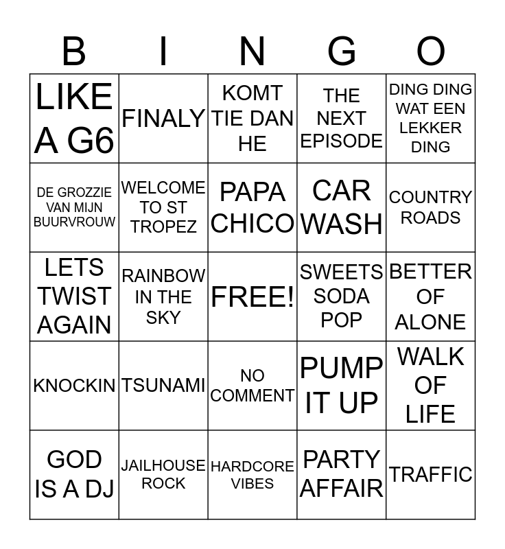 This bingo card has a free space and 24 words: TSUNAMI, JAILHOUSE ROCK, PAPA CHICO, GOD IS A DJ, DING DING WAT EEN LEKKER DING, LIKE A G6, DE GROZZIE VAN MIJN BUURVROUW, FINALY, SWEETS SODA POP, NO COMMENT, CAR WASH, LETS TWIST AGAIN, PUMP IT UP, WALK OF LIFE, WELCOME TO ST TROPEZ, PARTY AFFAIR, BETTER OF ALONE, KOMT TIE DAN HE, COUNTRY ROADS, RAINBOW IN THE SKY, TRAFFIC, KNOCKIN, THE NEXT EPISODE and HARDCORE VIBES.