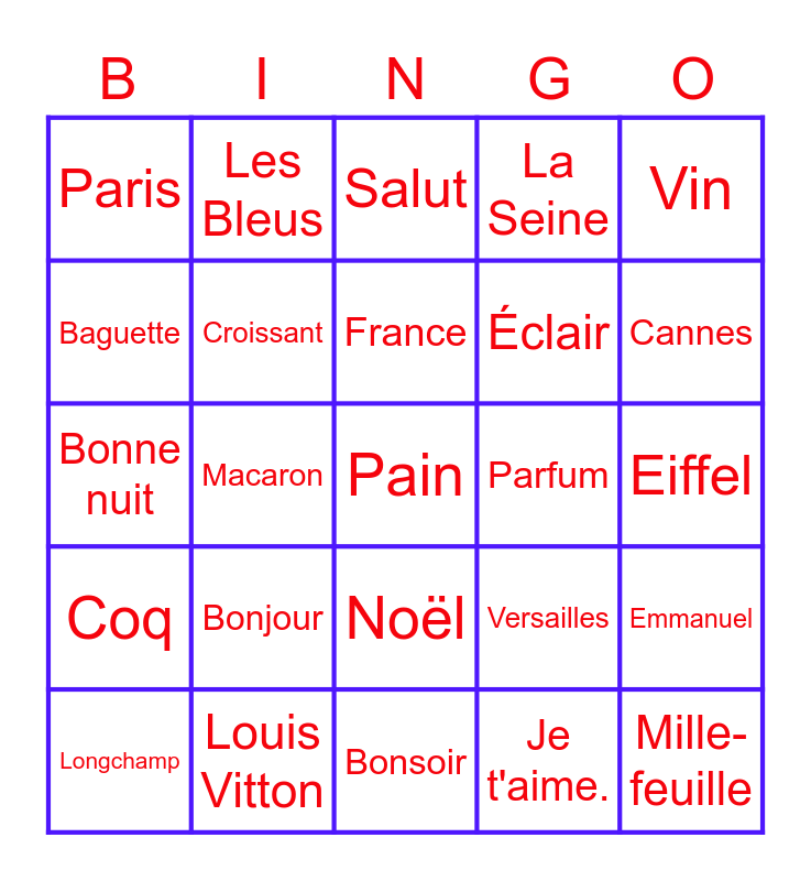 This bingo card has a free space and 24 words: Bonjour, Louis Vitton, France, Longchamp, Vin, Paris, Baguette, Les Bleus, Parfum, Noël, Éclair, Bonne nuit, Versailles, Emmanuel, Croissant, Je t'aime., Eiffel, Salut, Cannes, Macaron, Mille-feuille, Coq, La Seine and Bonsoir.