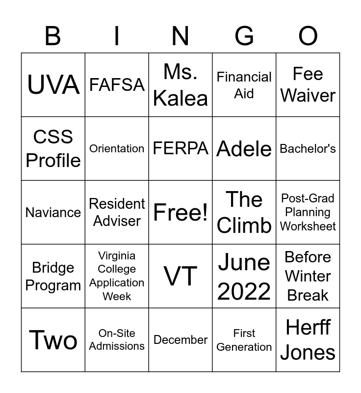 This bingo card has a free space and 24 words: Virginia College Application Week, On-Site Admissions, FERPA, Two, Fee Waiver, UVA, CSS Profile, FAFSA, The Climb, VT, Adele, Naviance, June 2022, Before Winter Break, Orientation, First Generation, Post-Grad Planning Worksheet, Ms. Kalea, Bachelor's, Resident Adviser, Herff Jones, Bridge Program, Financial Aid and December.