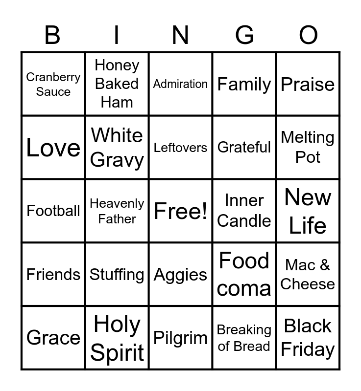 This bingo card has a free space and 52 words: Turkey, Black Friday, Smoked, Pilgrim, Stuffing, Giving thanks, Honey Baked Ham, Dressing, Love, Family, White Gravy, God's Word, Mac & Cheese, Food coma, Sweet Potato Pie, Chicken, Leftovers, Inner Candle, Brown Gravy, Praise, Heavenly Father, Breaking of Bread, Cranberry Sauce, Grateful, Apple Pie, Casserole, Feast, Holiday, Melting Pot, November, Peace, Family, Pumpkin Pie, Roast, Yams, Admiration, Holy Spirit, LoveWorld, Patience, Walk by Faith, Pecan Pie, New Life, Friends, Eternity, Aggies, Military Walk, Maroon, Football, Seed, Harvest, Grace and Seasonal.