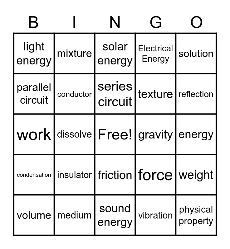 This bingo card has a free space and 37 words: solid, mass, refraction, conductor, weight, insulator, series circuit, gas, solution, matter, dissolve, Electrical Energy, physical property, energy, parallel circuit, condensation, physical state, solar energy, friction, gravity, light energy, reflection, volume, sound energy, density, vibration, mixture, mechanical energy, liquid, solubility, thermal energy, medium, work, evaporation, force, texture and magnetism.
