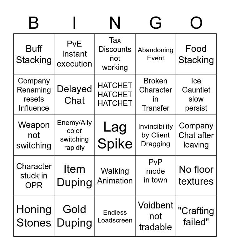This bingo card has a free space and 24 words: Item Duping, Gold Duping, HATCHET HATCHET HATCHET, Honing Stones, Food Stacking, Buff Stacking, Company Renaming resets Influence, PvE Instant execution, Invincibility by Client Dragging, Walking Animation, Broken Character in Transfer, Weapon not switching, PvP mode in town, No floor textures, Delayed Chat, Voidbent not tradable, Company Chat after leaving, Tax Discounts not working, Ice Gauntlet slow persist, Enemy/Ally color switching rapidly, "Crafting failed", Character stuck in OPR, Abandoning Event and Endless Loadscreen.