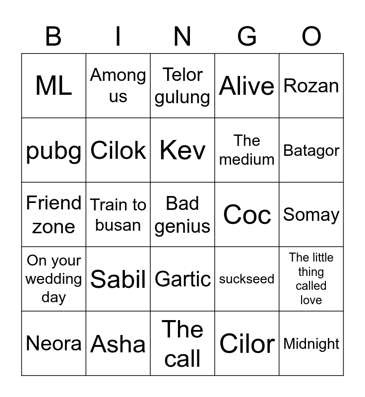 This bingo card has a free space and 24 words: Sabil, Asha, Kev, Neora, Rozan, ML, pubg, Among us, Coc, Gartic, The medium, Friend zone, suckseed, The little thing called love, Cilok, Cilor, Somay, Telor gulung, Batagor, Train to busan, Midnight, On your wedding day, Alive and The call.