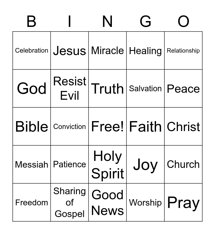 This bingo card has a free space and 28 words: Freedom, Restoration, Truth, Worship, Relationship, God, Jesus, Holy Spirit, Faith, Pray, Bible, Resist Evil, Guidance, Joy, Peace, Love, Patience, Miracle, Healing, Church, Celebration, Sharing of Gospel, Good News, Salvation, Christ, Messiah, Conviction and Transformation.