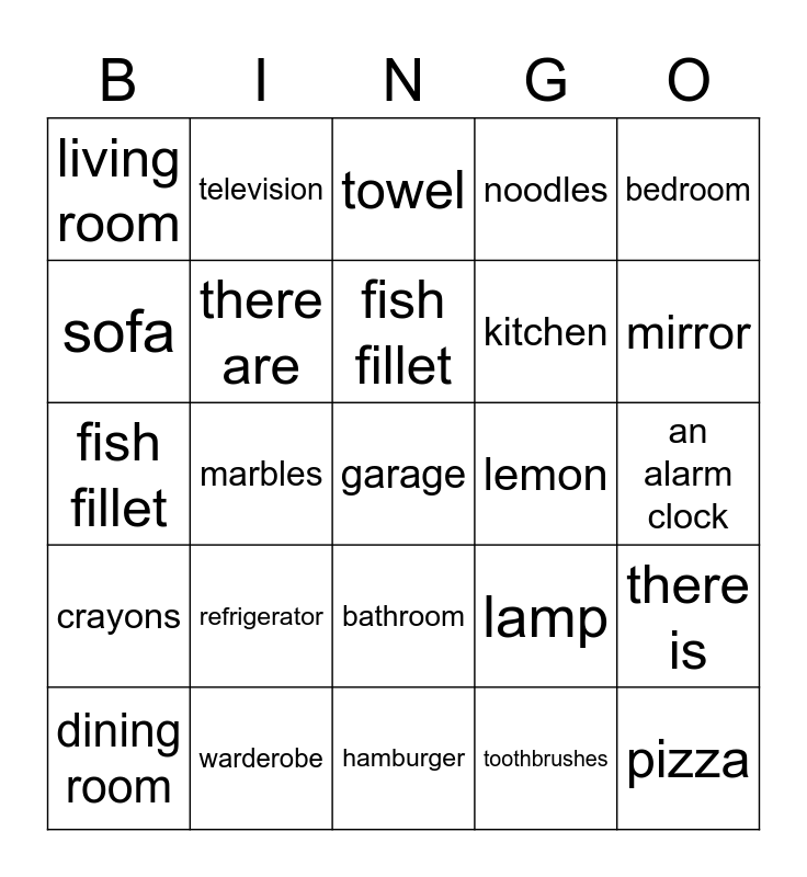 This bingo card has a free space and 24 words: refrigerator, warderobe, fish fillet, dining room, bedroom, living room, sofa, television, lemon, bathroom, kitchen, fish fillet, lamp, there is, there are, toothbrushes, an alarm clock, towel, mirror, marbles, pizza, crayons, noodles and hamburger.