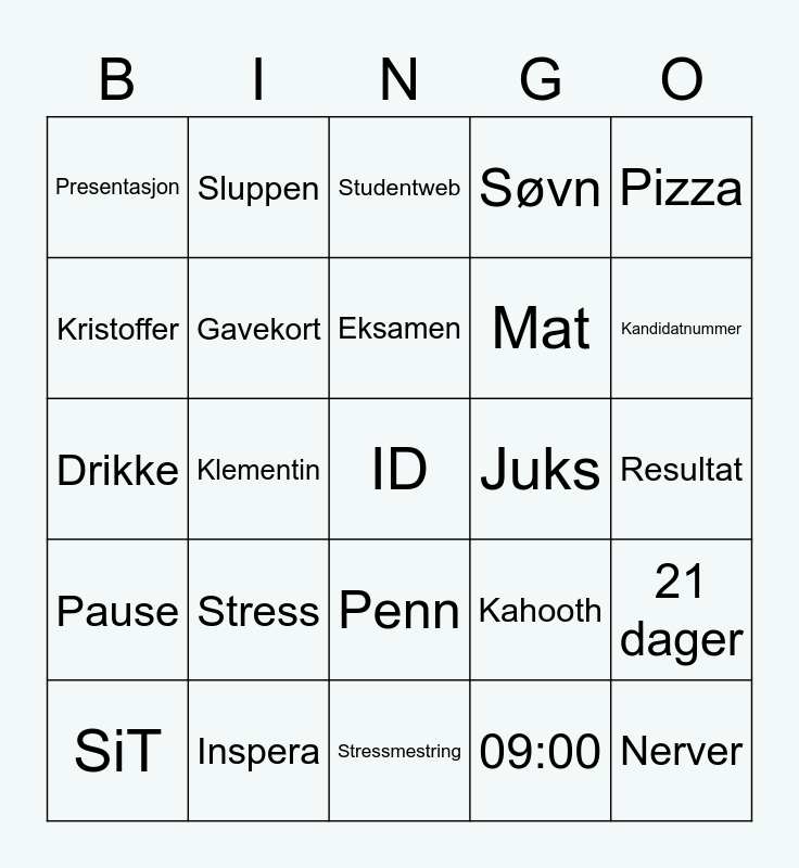 This bingo card has 25 words: Stress, Stressmestring, Eksamen, SiT, Pizza, Presentasjon, Kristoffer, Sluppen, Juks, Penn, Mat, Drikke, Kahooth, 21 dager, Gavekort, Nerver, Resultat, Studentweb, Kandidatnummer, Klementin, ID, Inspera, Pause, Søvn and 09:00.