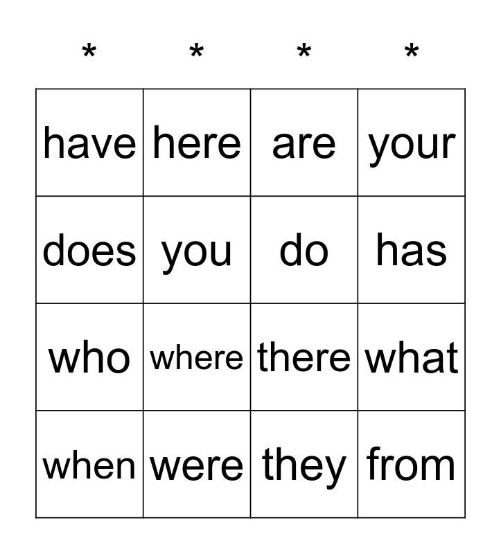This bingo card has 16 words: were, what, are, have, who, here, there, they, does, you, when, your, where, has, do and from.