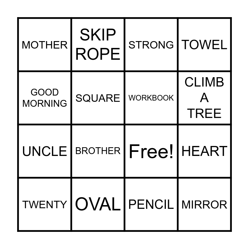 This bingo card has 18 words: BROTHER, MIRROR, STRONG, MOTHER, Free!, TOWEL, TWENTY, SKIP ROPE, CLIMB A TREE, UNCLE, PENCIL, GOOD MORNING, HEART, SQUARE, WORKBOOK, PURPLE, OVAL and TEACHER.