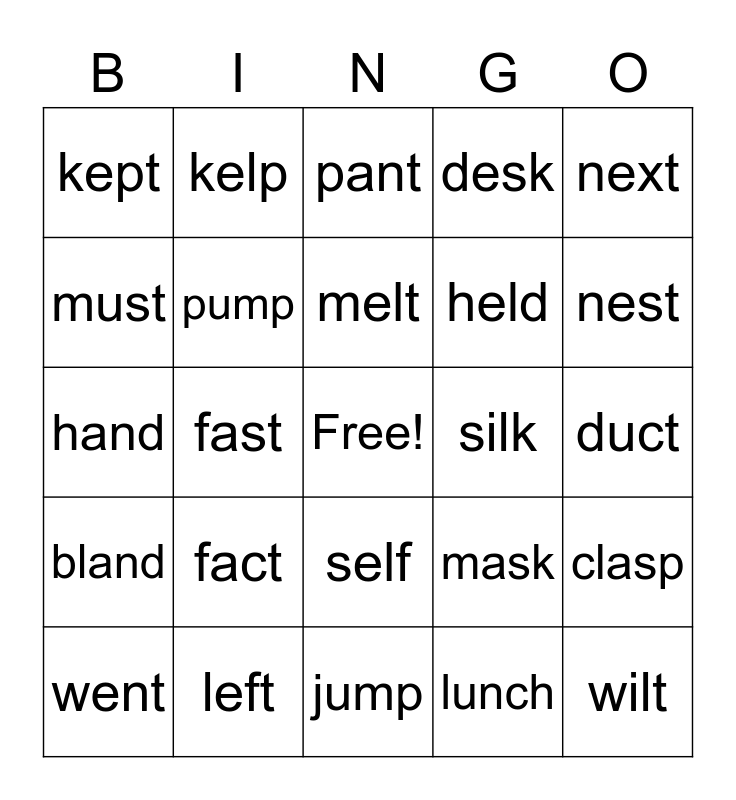 This bingo card has a free space and 24 words: fact, left, melt, went, next, kept, must, kelp, silk, self, held, hand, mask, clasp, pump, lunch, duct, pant, nest, fast, wilt, bland, desk and jump.