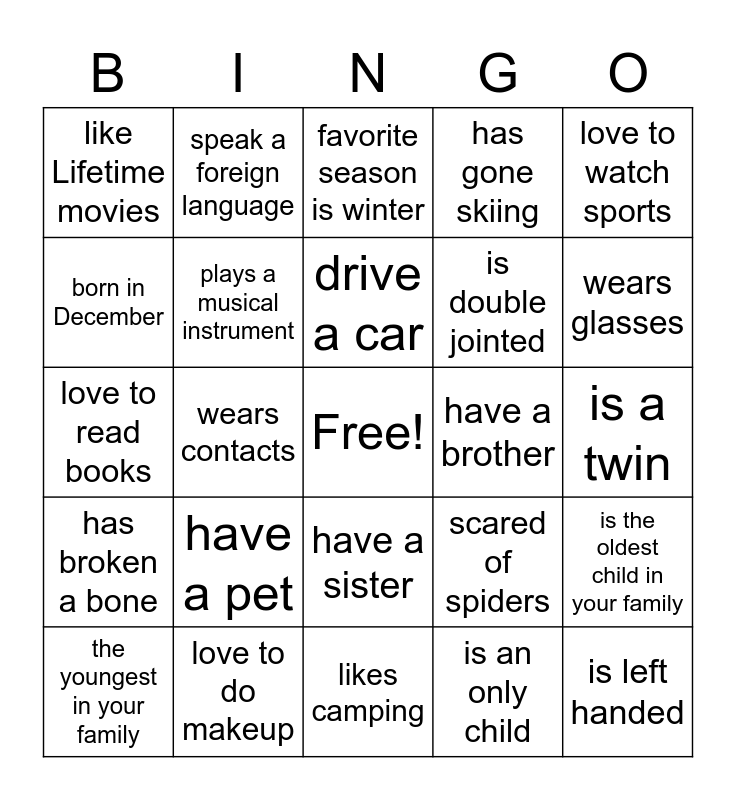 This bingo card has a free space and 24 words: have a pet, love to do makeup, drive a car, the youngest in your family, love to watch sports, like Lifetime movies, born in December, speak a foreign language, have a brother, have a sister, is double jointed, love to read books, scared of spiders, is the oldest child in your family, plays a musical instrument, is an only child, is a twin, favorite season is winter, wears glasses, wears contacts, is left handed, has broken a bone, has gone skiing and likes camping.