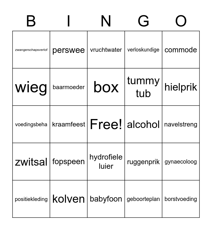This bingo card has a free space and 68 words: kinderwagen, borstvoeding, ochtendmisselijkheid, bijtring, aankleedkussen, zinkzalf, perswee, billendoekjes, box, foliumzuur, hydrofiele luier, ontsluting, navelstreng, commode, placenta, wieg, kraamfeest, zwangerschapsverlof, maxi-cosi, fopspeen, tummy tub, ruggenprik, zwitsal, baarkruk, nutrilon, navelklem, kraamzorg, maagzuur, gynaecoloog, stuitligging, vruchtwater, gender reveal party, luieruitslag, fruithapje, verloskundige, draagzak, kraamtranen, positiekleding, hielprik, voedingsbeha, nesthaartjes, vliezen, baarmoeder, keizersnede, hormonen, kraamverband, prenatal, vluchtkoffer, alcohol, kolven, incontinentie, spataderen, harde buiken, babyfoon, geboortekaartje, aambeien, geboorteplan, nesteldrang, ooievaar, kraampakket, nachtrust, zoogcompressen, kruik, nijntje, totaalruptuur, wieg, luiertas and luieremmer.