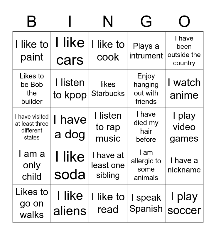 This bingo card has 30 words: I like aliens, I have curly hair, I have a dog, I like tacos, I like to paint, I like to cook, I listen to kpop, I have at least one sibling, I have died my hair before, I like to read, I play video games, I listen to rap music, I speak Spanish, I play soccer, I watch anime, I own a bird or a snake, I am allergic to some animals, I am a only child, I like soda, I have been outside the country, I have visited at least three different states, I enjoy school, I like cars, Enjoy hanging out with friends, Likes to be Bob the builder, Plays a intrument, I have a nickname, Likes to go on walks, likes Starbucks and I am awake.