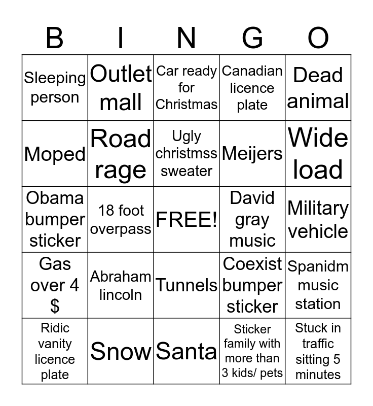 This bingo card has a free space and 24 words: Abraham lincoln, Snow, Ugly christmss sweater, Ridic vanity licence plate, Dead animal, Sleeping person, Moped, Outlet mall, David gray music, Tunnels, Meijers, Obama bumper sticker, Coexist bumper sticker, Spanidm music station, Road rage, Sticker family with more than 3 kids/ pets, Military vehicle, Car ready for Christmas, Wide load, 18 foot overpass, Stuck in traffic sitting 5 minutes, Gas over 4 $, Canadian licence plate and Santa.