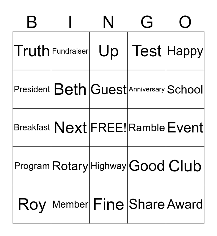 This bingo card has a free space and 24 words: Rotary, Member, Guest, Roy, Happy, Truth, President, Fundraiser, Ramble, Highway, Anniversary, Breakfast, Good, Club, Beth, Share, Event, Up, School, Next, Award, Program, Test and Fine.