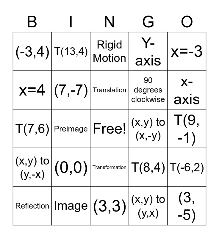 This bingo card has a free space and 28 words: T(-6,2), Rotation, 90 degrees clockwise, (x,y) to (y,x), x=4, Rigid Motion, T(13,4), (x,y) to (y,-x), (x,y) to (x,-y), Reflection, T(7,6), Y-axis, Image, (3,3), x-axis, T(6,-3), (0,0), (7,-7), Translation, Transformation, (-3,4), (x,y) to (-x,y), (3, -5), Preimage, T(9, -1), T(8,4), x=-3 and y=2.