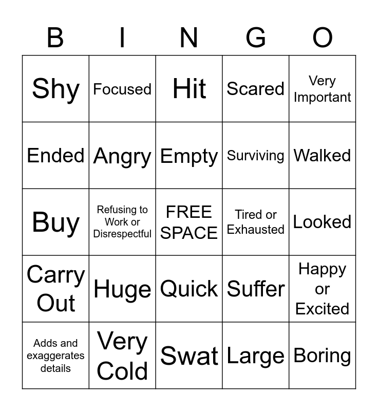 This bingo card has a free space and 24 words: Huge, Very Cold, Empty, Adds and exaggerates details, Very Important, Shy, Ended, Focused, Tired or Exhausted, Quick, Surviving, Buy, Suffer, Happy or Excited, Angry, Large, Looked, Hit, Walked, Refusing to Work or Disrespectful, Boring, Carry Out, Scared and Swat.