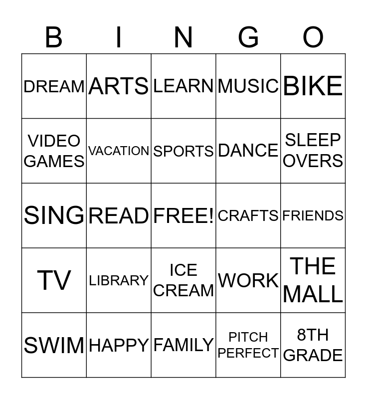 This bingo card has a free space and 24 words: LIBRARY, HAPPY, SPORTS, SWIM, BIKE, DREAM, VIDEO GAMES, ARTS, CRAFTS, ICE CREAM, DANCE, SING, WORK, THE MALL, VACATION, PITCH PERFECT, FRIENDS, LEARN, SLEEP OVERS, READ, 8TH GRADE, TV, MUSIC and FAMILY.
