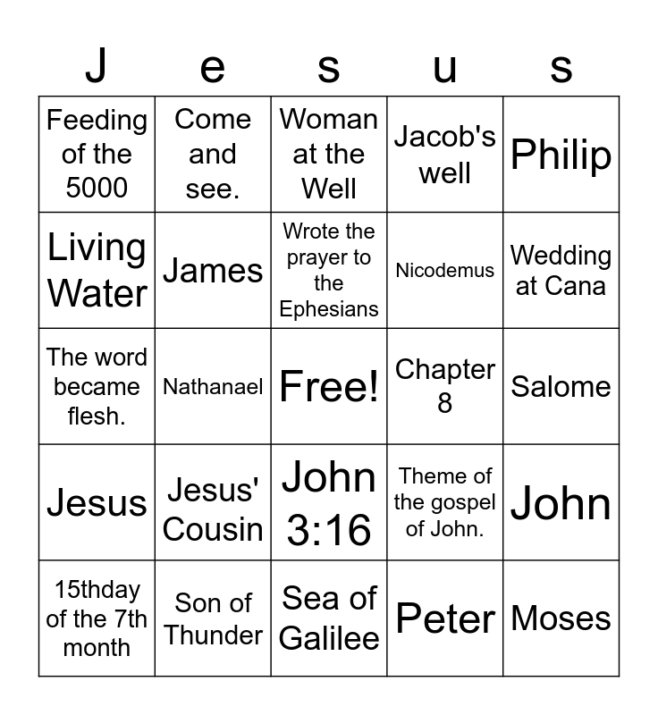 This bingo card has a free space and 24 words: Jesus' Cousin, Son of Thunder, Wrote the prayer to the Ephesians, 15thday of the 7th month, Philip, Feeding of the 5000, Living Water, Come and see., Chapter 8, John 3:16, Nicodemus, The word became flesh., Theme of the gospel of John., John, James, Peter, Salome, Woman at the Well, Wedding at Cana, Nathanael, Moses, Jesus, Jacob's well and Sea of Galilee.