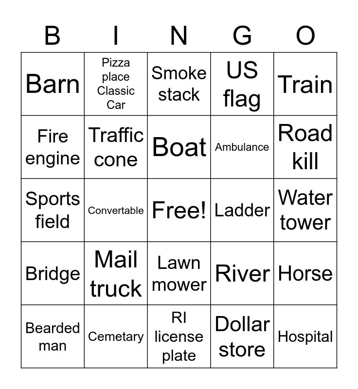 This bingo card has a free space and 44 words: Vet, Hospital, GarbA, Bearded man, Open weigh station, Dollar store, Smoke stack, Towed vehicle, Train, Cemetary, US flag, Ladder, Lawn mower, Mail truck, Military vehicle, RI license plate, Church van, Sports field, Playground, Road kill, Pizza place Classic Car, Hay bale, Cross, Barn, Silo, Water tower, Uhaul, Bike, River, Bridge, Cow, Horse, Bird, Tractor, Convertable, Motorcycle, Place, Bus, Boat, Fire engine, Ambulance, Police car, Traffic cone and School.