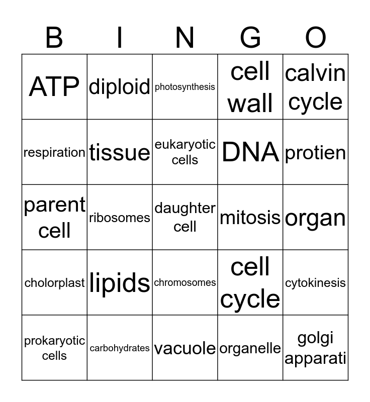This bingo card has a free space and 24 words: lipids, carbohydrates, eukaryotic cells, prokaryotic cells, calvin cycle, ATP, respiration, diploid, mitosis, chromosomes, DNA, parent cell, cell cycle, cytokinesis, tissue, organelle, organ, photosynthesis, protien, ribosomes, golgi apparati, cholorplast, cell wall and vacuole.