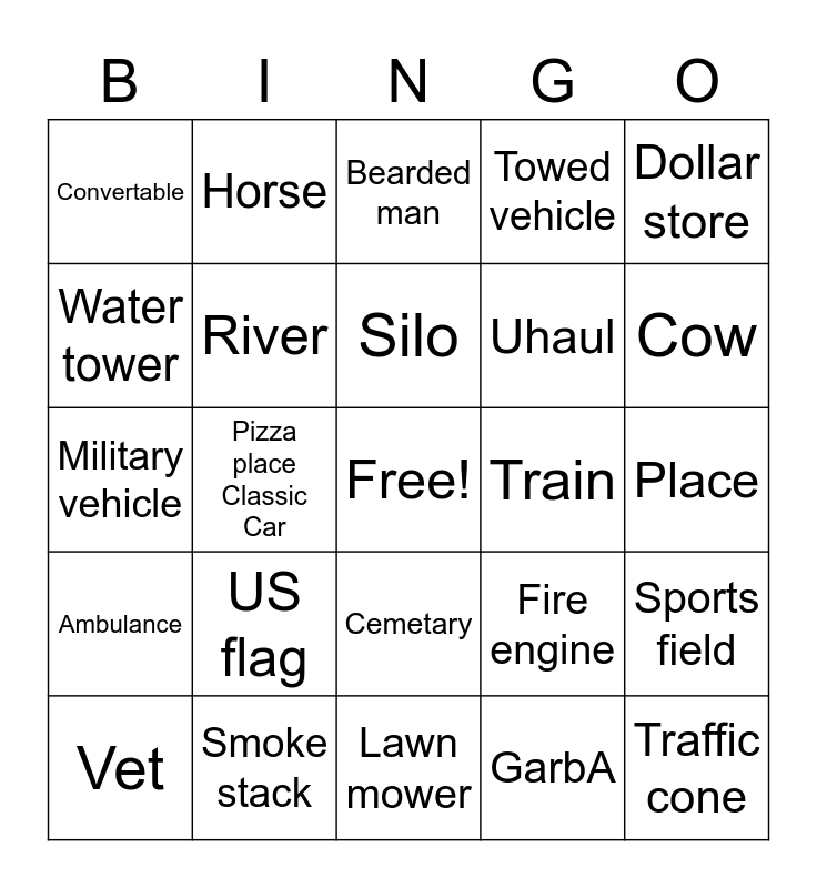 This bingo card has a free space and 44 words: Police car, Traffic cone, School, Vet, Hospital, GarbA, Bearded man, Open weigh station, Dollar store, Smoke stack, Towed vehicle, Train, Cemetary, US flag, Ladder, Lawn mower, Mail truck, Military vehicle, RI license plate, Cow, Horse, Bird, Tractor, Convertable, Motorcycle, Place, Bus, Boat, Fire engine, Ambulance, Church van, Sports field, Playground, Road kill, Pizza place Classic Car, Hay bale, Cross, Barn, Silo, Water tower, Uhaul, Bike, River and Bridge.
