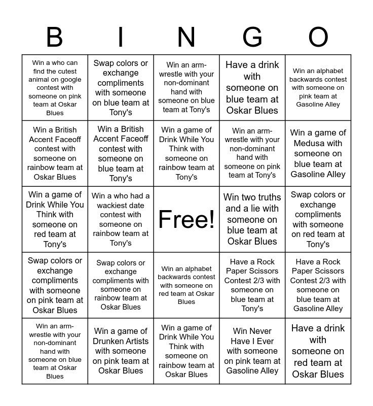 This bingo card has a free space and 171 words: Have a drink with someone on red team at Tony's, Win two truths and a lie with someone on red team at Tony's, Win an alphabet backwards contest with someone on red team at Tony's, Come up with a secret handshake and perform it before we leave the bar with someone on red team at Tony's, Swap colors or exchange compliments with someone on red team at Tony's, Win a who can find the cutest animal on google contest with someone on red team at Tony's, Win Never Have I Ever with someone on red team at Tony's, Win a who had a wackiest date contest with someone on red team at Tony's, Win a British Accent Faceoff contest with someone on red team at Tony's, Have a Rock Paper Scissors Contest 2/3 with someone on red team at Tony's, Win an arm-wrestle with your non-dominant hand with someone on red team at Tony's, Win a game of Medusa with someone on red team at Tony's, Win a game of Drink While You Think with someone on red team at Tony's, Win a game of Drunken Artists with someone on red team at Tony's, Have a drink with someone on red team at Oskar Blues, Win two truths and a lie with someone on red team at Oskar Blues, Win an alphabet backwards contest with someone on red team at Oskar Blues, Come up with a secret handshake and perform it before we leave the bar with someone on red team at Oskar Blues, Swap colors or exchange compliments with someone on red team at Oskar Blues, Win a who can find the cutest animal on google contest with someone on red team at Oskar Blues, Win Never Have I Ever with someone on red team at Oskar Blues, Win a who had a wackiest date contest with someone on red team at Oskar Blues, Win a British Accent Faceoff contest with someone on red team at Oskar Blues, Have a Rock Paper Scissors Contest 2/3 with someone on red team at Oskar Blues, Win an arm-wrestle with your non-dominant hand with someone on red team at Oskar Blues, Win a game of Medusa with someone on red team at Oskar Blues, Win a game of Drink While You Think with someone on red team at Oskar Blues, Win a game of Drunken Artists with someone on red team at Oskar Blues, Have a drink with someone on red team at Gasoline Alley, Win two truths and a lie with someone on red team at Gasoline Alley, Win an alphabet backwards contest with someone on red team at Gasoline Alley, Come up with a secret handshake and perform it before we leave the bar with someone on red team at Gasoline Alley, Swap colors or exchange compliments with someone on red team at Gasoline Alley, Win a who can find the cutest animal on google contest with someone on red team at Gasoline Alley, Win Never Have I Ever with someone on red team at Gasoline Alley, Win a who had a wackiest date contest with someone on red team at Gasoline Alley, Win a British Accent Faceoff contest with someone on red team at Gasoline Alley, Have a Rock Paper Scissors Contest 2/3 with someone on red team at Gasoline Alley, Win an arm-wrestle with your non-dominant hand with someone on red team at Gasoline Alley, Win a game of Medusa with someone on red team at Gasoline Alley, Win a game of Drink While You Think with someone on red team at Gasoline Alley, Win a game of Drunken Artists with someone on red team at Gasoline Alley, Have a drink with someone on pink team at Tony's, Win two truths and a lie with someone on pink team at Tony's, Win an alphabet backwards contest with someone on pink team at Tony's, Come up with a secret handshake and perform it before we leave the bar with someone on pink team at Tony's, Swap colors or exchange compliments with someone on pink team at Tony's, Win a who can find the cutest animal on google contest with someone on pink team at Tony's, Win Never Have I Ever with someone on pink team at Tony's, Win a who had a wackiest date contest with someone on pink team at Tony's, Win a British Accent Faceoff contest with someone on pink team at Tony's, Have a Rock Paper Scissors Contest 2/3 with someone on pink team at Tony's, Win an arm-wrestle with your non-dominant hand with someone on pink team at Tony's, Win a game of Medusa with someone on pink team at Tony's, Win a game of Drink While You Think with someone on pink team at Tony's, Win a game of Drunken Artists with someone on pink team at Tony's, Have a drink with someone on pink team at Oskar Blues, Win two truths and a lie with someone on pink team at Oskar Blues, Win an alphabet backwards contest with someone on pink team at Oskar Blues, Come up with a secret handshake and perform it before we leave the bar with someone on pink team at Oskar Blues, Swap colors or exchange compliments with someone on pink team at Oskar Blues, Win a who can find the cutest animal on google contest with someone on pink team at Oskar Blues, Win Never Have I Ever with someone on pink team at Oskar Blues, Win a who had a wackiest date contest with someone on pink team at Oskar Blues, Win a British Accent Faceoff contest with someone on pink team at Oskar Blues, Have a Rock Paper Scissors Contest 2/3 with someone on pink team at Oskar Blues, Win an arm-wrestle with your non-dominant hand with someone on pink team at Oskar Blues, Win a game of Medusa with someone on pink team at Oskar Blues, Win a game of Drink While You Think with someone on pink team at Oskar Blues, Win a game of Drunken Artists with someone on pink team at Oskar Blues, Have a drink with someone on pink team at Gasoline Alley, Win two truths and a lie with someone on pink team at Gasoline Alley, Win an alphabet backwards contest with someone on pink team at Gasoline Alley, Come up with a secret handshake and perform it before we leave the bar with someone on pink team at Gasoline Alley, Swap colors or exchange compliments with someone on pink team at Gasoline Alley, Win a who can find the cutest animal on google contest with someone on pink team at Gasoline Alley, Win Never Have I Ever with someone on pink team at Gasoline Alley, Win a who had a wackiest date contest with someone on pink te