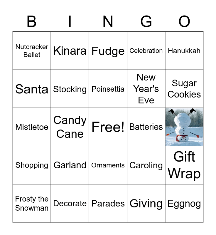 This bingo card has 2 images, a free space and 67 words: Holiday Lights, Candles, Decorate, Gifts, Celebration, Kwanzaa, Hanukkah, Dreidel, Gift Wrap, Bows, Nutcracker Ballet, Fudge, Fruit Cake, Candy Cane, Ornaments, New Year's Eve, Christmas, Shopping, Batteries, Caroling, Sugar Cookies, Fireplace, Reindeer, Wreath, Umoja/Unity, Nia/Purpose, Giving, Karamu, Kinara, Festive of Lights, Menorah, Dreidel, Dedicate, 2022, Family, Friends, Santa, Tree, Garland, Eggnog, Charity, Travel, It's a Wonderful Life, Frosty the Snowman, Sleigh Ride, Matching PJs, Gingerbread House, Stocking, Poinsettia, Ribbon, Holly, Parades, Bowl Games, Greeting Cards, Peppermint, Nice List, Elf, Mistletoe, Parties, Appetizers, NYC Ball Drop, Star, Bells, Red Kettles, Friendsgiving, Naps and Festivus for the rest of Us.
