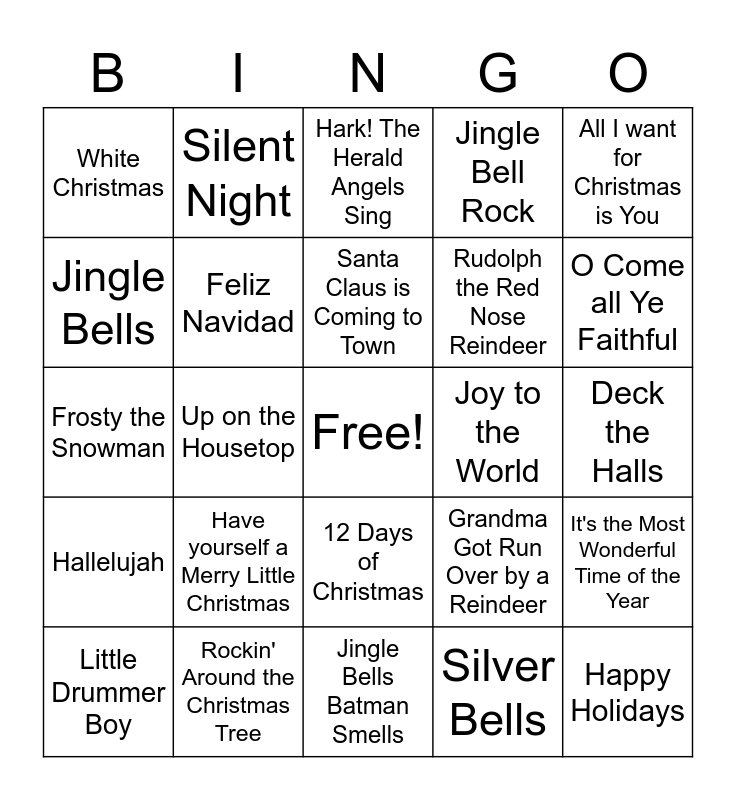 This bingo card has a free space and 24 words: Have yourself a Merry Little Christmas, Rockin' Around the Christmas Tree, Santa Claus is Coming to Town, Little Drummer Boy, All I want for Christmas is You, White Christmas, Jingle Bells, Silent Night, Joy to the World, 12 Days of Christmas, Rudolph the Red Nose Reindeer, Frosty the Snowman, Grandma Got Run Over by a Reindeer, It's the Most Wonderful Time of the Year, Feliz Navidad, Silver Bells, Deck the Halls, Hark! The Herald Angels Sing, O Come all Ye Faithful, Up on the Housetop, Happy Holidays, Hallelujah, Jingle Bell Rock and Jingle Bells Batman Smells.