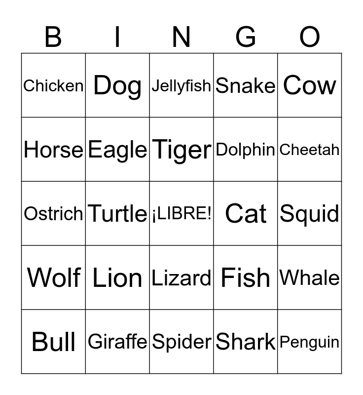 This bingo card has a free space and 24 words: Lion, Giraffe, Tiger, Bull, Cow, Chicken, Horse, Dog, Cat, Lizard, Dolphin, Ostrich, Fish, Whale, Eagle, Shark, Squid, Jellyfish, Cheetah, Turtle, Penguin, Wolf, Snake and Spider.
