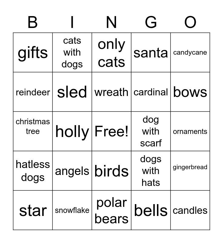 This bingo card has a free space and 27 words: dogs with hats, penguins, cardinal, polar bears, reindeer, only cats, cats with dogs, hatless dogs, dog with scarf, gingerbread, christmas tree, santa, star, snowflake, bows, snowman, sled, wreath, angels, gifts, ornaments, bells, holly, candles, birds, candycane and dogs with hats.