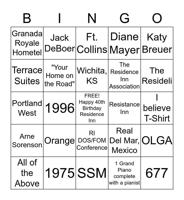 This bingo card has a free space and 24 words: Orange, 1975, Wichita, KS, All of the Above, Katy Breuer, Granada Royale Hometel, Terrace Suites, Jack DeBoer, Resistance Inn, RI DOS/FOM Conference, The Residence Inn Association, Portland West, Real Del Mar, Mexico, OLGA, "Your Home on the Road", 1 Grand Piano complete with a pianist, I believe T-Shirt, Ft. Collins, The Resideli, 1996, 677, Arne Sorenson, Diane Mayer and SSM.